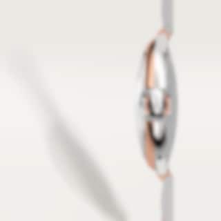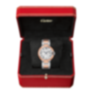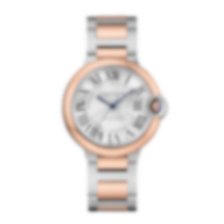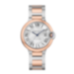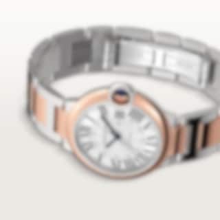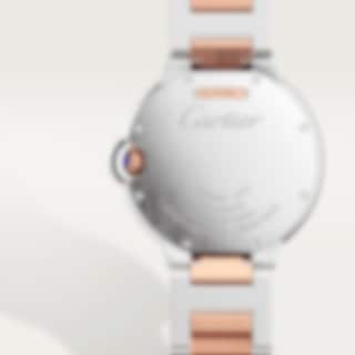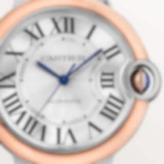 Ballon Bleu de Cartier watch, 36 mm, mechanical movement with automatic winding. Steel case, rose gold 750/1000 bezel, fluted rose gold 750/1000 crown set with a synthetic cabochon-shaped spinel. Silvered guilloché dial. Blued-steel sword-shaped hands. Sapphire crystal. Interchangeable two-tone bracelet. Thickness: 12.1 mm. Water-resistant to 3 bar (approx. 30 metres).
