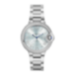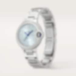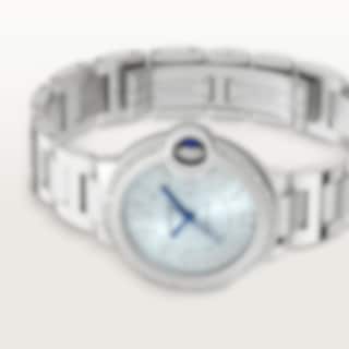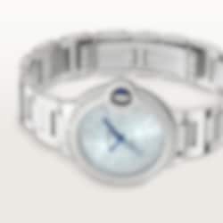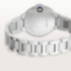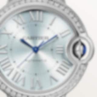 Ballon Bleu de Cartier watch, 33 mm, mechanical movement with automatic winding. Steel case, fluted crown set with a synthetic cabochon-shaped spinel, steel bezel set with 50 brilliant-cut diamonds totaling 0.58 carat, blue silvered sunray-brushed dial, blued-steel sword-shaped hands, sapphire crystal, interchangeable steel bracelet. Thickness: 10.16 mm. Water-resistant up to 3 bar (approx. 30 meters/100 feet).