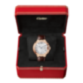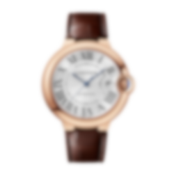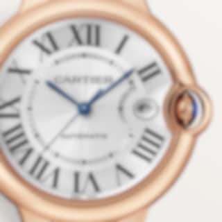 Ballon Bleu de Cartier watch, 40 mm, manufacture mechanical movement with automatic winding, caliber 1847 MC. 18K rose gold (750/1000) case, fluted crown set with a blue sapphire cabochon, silvered guilloché dial, blued-steel sword-shaped hands, sapphire crystal, interchangeable brown alligator leather strap, interchangeable 18K rose gold (750/1000) deployant buckle, calendar aperture at 3 o’clock. Thickness: 12.4 mm. Water-resistant up to 3 bar (approx. 30 meters/100 feet).