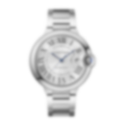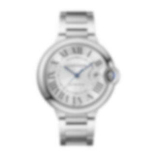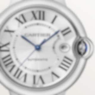 Ballon Bleu de Cartier watch, 40 mm, Manufacture mechanical movement with automatic winding, caliber 1847 MC. Steel case, fluted crown set with a synthetic cabochon-shaped spinel, silvered guilloché dial, blued-steel sword-shaped hands, sapphire crystal, steel interchangeable bracelet, calendar aperture at 3 o'clock. Thickness: 12.4 mm. Water-resistant up to 3 bar (approx. 30 meters/100 feet).