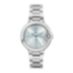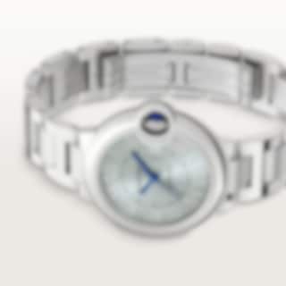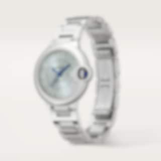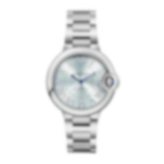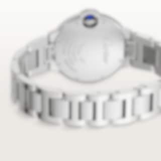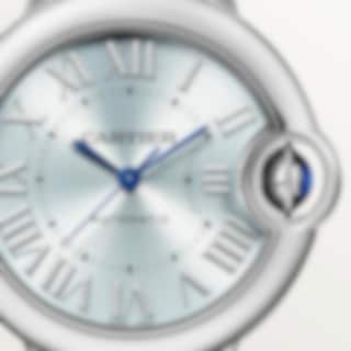Ballon Bleu de Cartier watch, 33 mm, mechanical movement with automatic winding. Steel case, fluted crown set with a synthetic cabochon-shaped spinel, blue silvered sunray-brushed dial, blued-steel sword-shaped hands, sapphire crystal, interchangeable steel bracelet. Thickness: 10.16 mm. Water-resistant up to 3 bar (approx. 30 meters/100 feet).