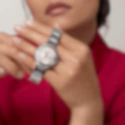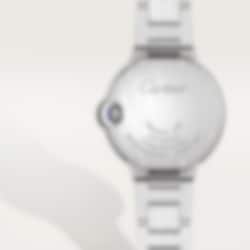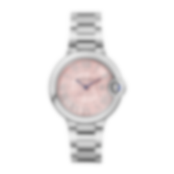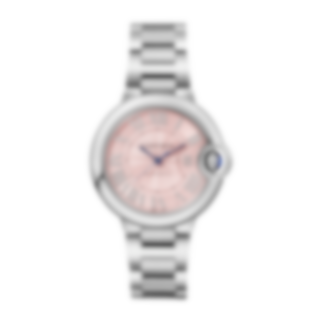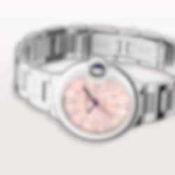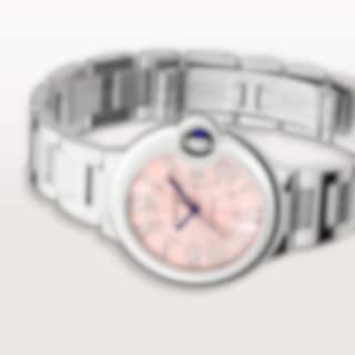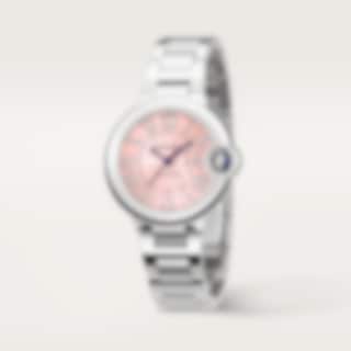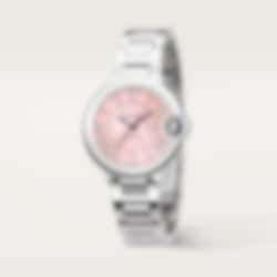Ballon Bleu de Cartier watch, 33 mm, mechanical movement with automatic winding, calibre 1853. Steel case, fluted steel crown set with a synthetic cabochon-shaped spinel. Pink sunray dial. Blued-steel sword-shaped hands. Sapphire crystal. Interchangeable steel bracelet. Case diameter: 33 mm, thickness: 10.16 mm. Water-resistant up to 3 bar (approx. 30 metres).