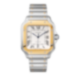 Santos watch, large model, mechanical movement with automatic winding, calibre 1847 MC. Steel case and 18K yellow gold bezel, 7-sided crown set with a faceted synthetic spinel, silvered opaline dial, blued-steel sword-shaped hands, sapphire crystal. Steel bracelet with “SmartLink” adjustment system. Second bracelet in calfskin, with interchangeable steel folding buckle. Both bracelets are fitted with the “QuickSwitch” interchangeability system. Case width: 39.8 mm, thickness: 9.08 mm.