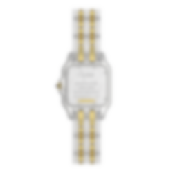 Panthère de Cartier watch, medium model, quartz movement. Case in yellow gold 750/1000 and steel, dimensions: 29 mm x 37 mm, thickness: 6 mm, crown set with a synthetic blue spinel, silvered dial, blued-steel sword-shaped hands, bracelet in yellow gold 750/1000 and steel, water-resistant to 3 bar (around 30 metres).