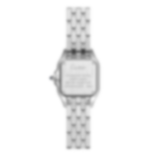Panthère de Cartier watch, small model, quartz movement. Case in steel, dimensions: 23 mm x 30 mm, thickness: 6 mm, crown set with a synthetic blue spinel, silvered dial, blued-steel sword-shaped hands, steel bracelet, water-resistant to 3 bar (around 30 metres)