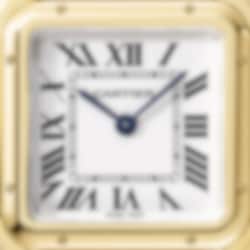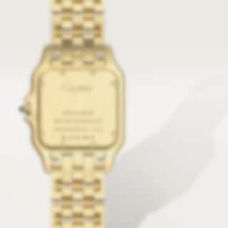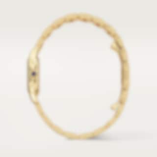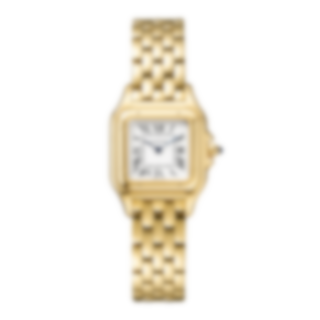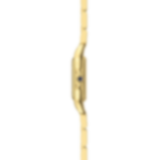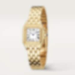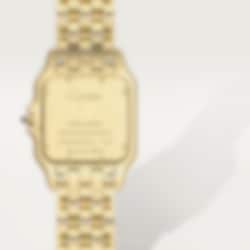 Panthère de Cartier watch, small model, quartz movement. Case in yellow gold 750/1000, dimensions: 23 mm x 30 mm, thickness: 6 mm, crown set with a blue sapphire, silvered dial, blued-steel sword-shaped hands, yellow gold 750/1000 bracelet, water-resistant to 3 bar (around 30 metres). Non-contractual photo (the length of the watch strap may vary slightly).