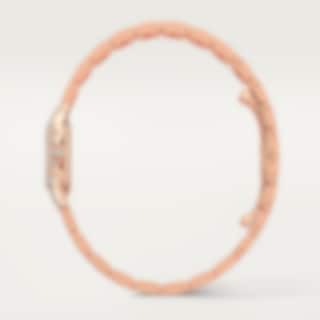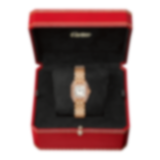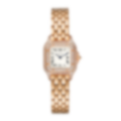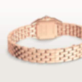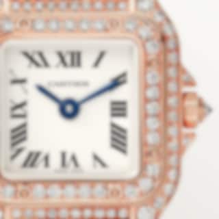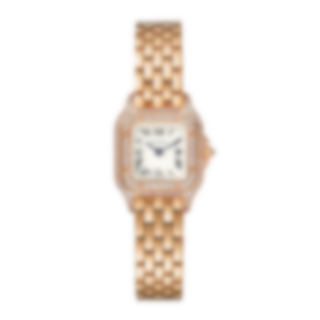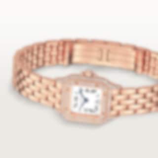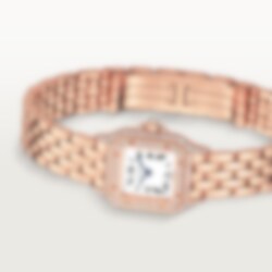 Panthère de Cartier watch, mini model, quartz movement. Rose gold 750/1000 case set with brilliant-cut diamonds. Rose gold 750/1000 octagonal crown set with a brilliant-cut diamond. Silvered dial, blued-steel sword-shaped hands, sapphire crystal. Rose gold 750/1000 bracelet. Dimensions: 25 mm x 20 mm, thickness: 6 mm. Water-resistant to 3 bar (approx. 30 metres). Non-contractual photo (the length of the watch strap may vary slightly).