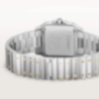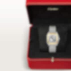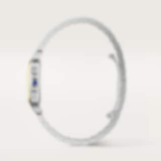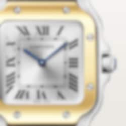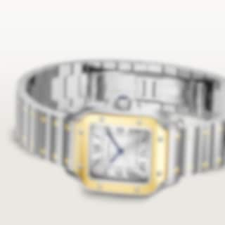 Santos de Cartier watch, small model, quartz movement. 18K yellow gold (750/1000) and steel case, 7-sided crown set with a synthetic faceted blue spinel, silver sunray dial, blued-steel sword-shaped hands, sapphire crystal. 18K yellow gold (750/1000) and steel bracelet. Second strap in dark blue calfskin leather with steel ardillon buckle. Both straps are fitted with the an interchangeability system. Dimensions: 27 mm x 34.5 mm, thickness: 7.08 mm. Water-resistant up to 3 bar (approx. 30 meters/100 feet).