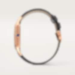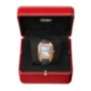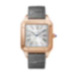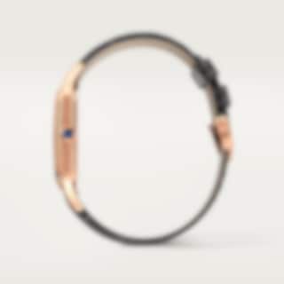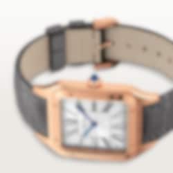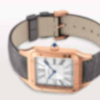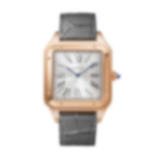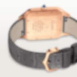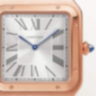 Santos-Dumont watch, extra-large model, Manufacture mechanical movement with manual winding, caliber 430 MC. 18K rose gold (750/1000) case, beaded crown set with a cabochon sapphire, silver satin-finish dial with sunray-effect, Roman numerals, blued-steel sword-shaped hands, sapphire crystal. Gray alligator leather strap and 18K rose gold (750/1000) ardillon buckle. Case dimensions: 46.6 mm x 33.9 mm, thickness: 7.5 mm. Water-resistant up to 3 bar (approx. 30 meters/100 feet).