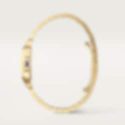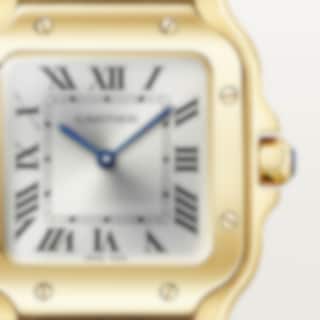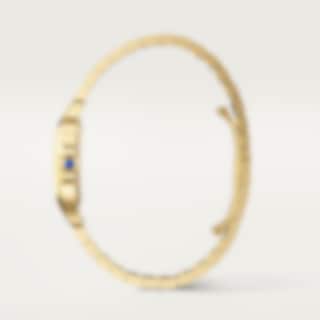 Santos de Cartier watch, small model, quartz movement. 18K yellow gold (750/1000) case, 7-sided crown set with a faceted sapphire, silver sunray dial, blued-steel sword-shaped hands, sapphire crystal. 18K yellow gold (750/1000) bracelet. Second strap in dark blue alligator leather with 18K yellow gold (750/1000) ardillon buckle. Both straps are fitted with the an interchangeability system. Dimensions: 27 mm x 34.5 mm, thickness: 7.08 mm. Water-resistant up to 3 bar (approx. 30 meters/100 feet).