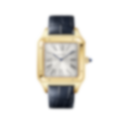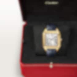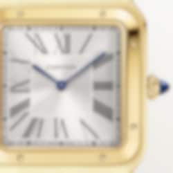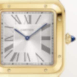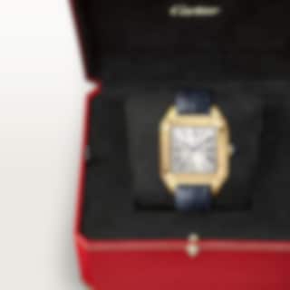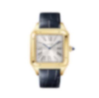 Santos-Dumont watch, extra-large model, Manufacture mechanical movement with manual winding, caliber 430 MC. 18K yellow gold (750/1000) case, beaded crown set with a sapphire cabochon, silvered satin-finished dial with sunray-effect, Roman numerals, blued-steel sword-shaped hands, sapphire crystal. Blue alligator leather strap, 18K yellow gold (750/1000) ardillon buckle. Case dimensions: 46.6 mm x 33.9 mm, thickness: 7.5 mm. Water-resistant up to 3 bar (approx. 30 meters/100 feet).