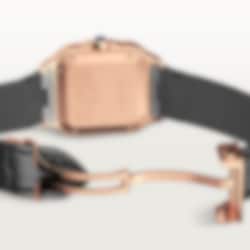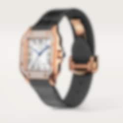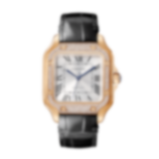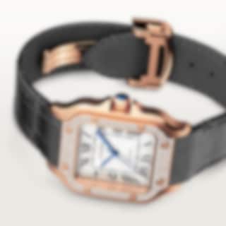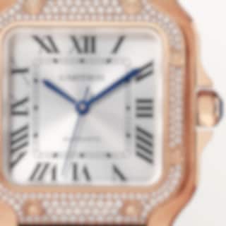 Santos watch, medium model, Manufacture mechanical movement with automatic winding, caliber 1847 MC. 18K rose gold (750/1000) case, bezel set with brilliant-cut diamonds. 18K rose gold (750/1000) 7-sided crown set with a faceted sapphire, sunray-effect dial, blued-steel sword-shaped hands, sapphire crystal. Two alligator-skin straps with the “QuickSwitch” interchangeability system, interchangeable folding buckle in 18K rose gold (750/1000). Case width: 35.1 mm, thickness: 8.83 mm. Water-resistant up to 10 bar (approx. 100 meters/100 feet).