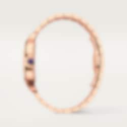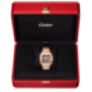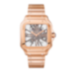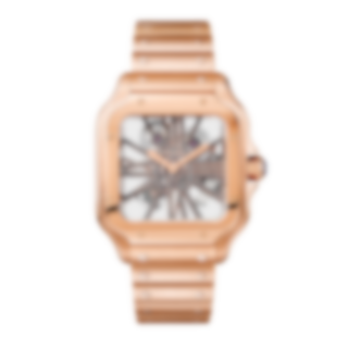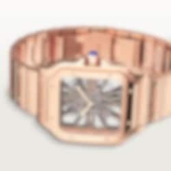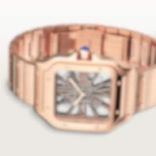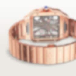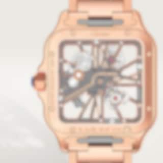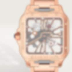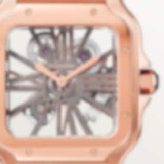 Santos Skeleton watch, large model, Manufacture mechanical movement with manual winding, caliber 9619 MC. Rose gold 750/1000 case, rose gold 750/1000 heptagonal crown set with a faceted sapphire, gold sword-shaped hands, sapphire crystal and case back. Rose gold 750/1000 bracelet with “SmartLink” adjustment system. Second bracelet in alligator leather, with rose gold 750/1000 interchangeable deployant buckle. Both bracelets are equipped with the “QuickSwitch” interchangeability system. Hours and minutes with skeletonized bridges forming Roman numerals. Individually numbered movement consisting of 138 parts including 20 rubies. Movement dimensions: 28 mm x 28 mm, movement thickness: 3.97 mm, balance: 28,800 vibrations/hour, power reserve approx. 72 hours. Case width: 39.7 mm, thickness: 9.08 mm. Water-resistant up to 10 bar (approx. 100 meters/330 feet).