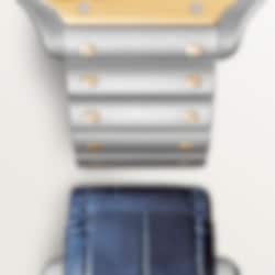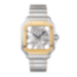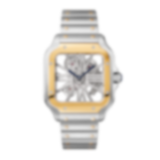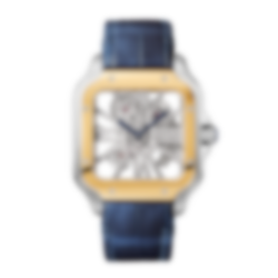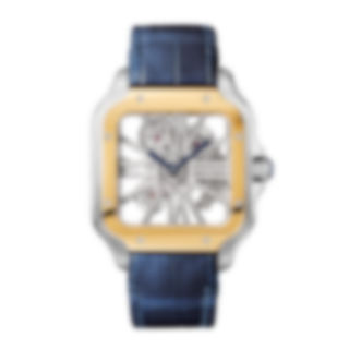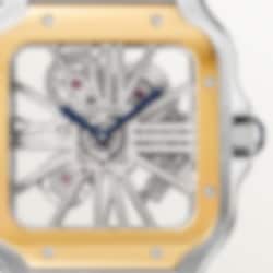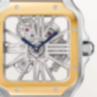 Santos Skeleton watch, large model, Manufacture mechanical movement with manual winding, caliber 9611 MC. Steel case, yellow gold 750/1000 bezel, 7-sided crown set with a faceted sapphire, blued-steel sword-shaped hands, sapphire crystal case back. Steel bracelet with "SmartLink" adjustment system. Second bracelet in veal leather, with double adjustable steel deployant buckle. Both bracelets are fitted with the "QuickSwitch" interchangeability system. Hours and minutes with skeletonized bridges forming Roman numerals. Individually numbered movement consisting of 138 parts including 20 rubies. Movement dimensions: 28 mm x 28 mm, movement thickness: 3.97 mm, balance: 28,800 vibrations/hour, power reserve approx. 72 hours. Case width: 39.7 mm, thickness: 9.08 mm. Water-resistant up to 10 bar (approx. 100 meters/330 feet).