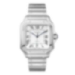 Santos watch, large model, mechanical movement with automatic winding, calibre 1847 MC. Steel case, 7-sided crown set with a faceted synthetic spinel, silvered opaline dial, steel sword-shaped hands, sapphire crystal. Steel bracelet with “SmartLink” adjustment system. Second bracelet in calfskin, with interchangeable steel folding buckle. Both bracelets are fitted with the “QuickSwitch” interchangeability system. Case width: 39.8 mm, thickness: 9.08 mm.