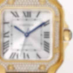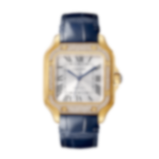 Santos watch, medium model, Manufacture mechanical movement with automatic winding, caliber 1847 MC. 18K yellow gold (750/1000) case, bezel set with brilliant-cut diamonds. 18K yellow gold (750/1000) 7-sided crown set with a faceted sapphire, sunray-effect dial, blued-steel sword-shaped hands, sapphire crystal. Two alligator-skin straps with the “QuickSwitch” interchangeability system, interchangeable folding buckle in 18K yellow gold (750/1000). Case width: 35.1 mm, thickness: 8.83 mm. Water-resistant up to 10 bar (approx. 100 meters/100 feet).