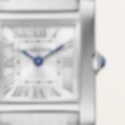 Tank Française watch, small model, quartz movement. Steel case. Faceted crown in steel decorated with a synthetic cabochon-shaped spinel. Silvered sunray dial, blued-steel sword-shaped hands, sapphire crystal. Steel bracelet. Case dimensions: 25.7 mm x 21.2 mm, thickness: 6.8 mm. Water-resistant to 3 bar (approx. 30 metres).