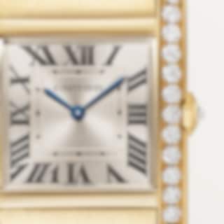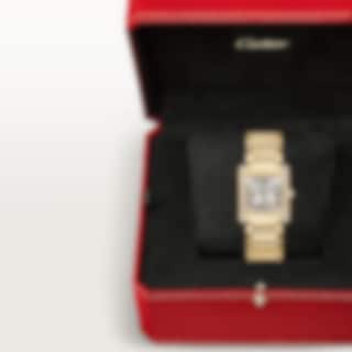 Tank Française watch, medium model, quartz movement. Case and faceted crown in yellow gold 750/1000 set with 27 brilliant-cut diamonds totalling 1.22 carats. Golden sunray dial, blued-steel sword-shaped hands, sapphire crystal. Bracelet in yellow gold 750/1000. Case dimensions: 32 mm x 27 mm, thickness: 7.1 mm. Water-resistant to 3 bar (approx. 30 metres).