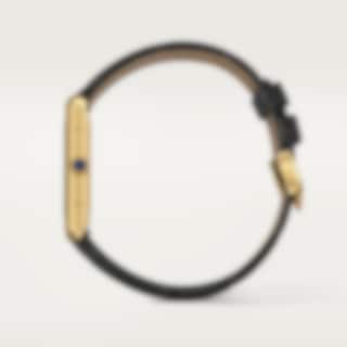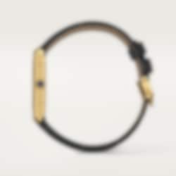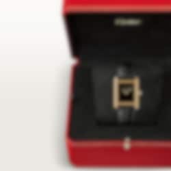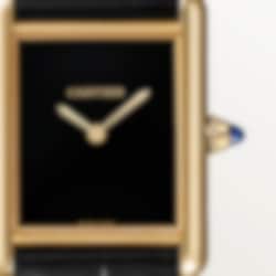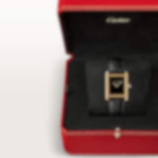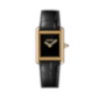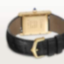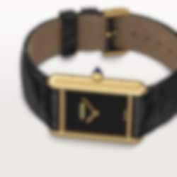 Tank Louis Cartier watch, large model, Manufacture mechanical movement with manual winding. Case in yellow gold 750/1000, beaded crown set with a sapphire, black lacquer dial, golden-finish steel sword-shaped hands, mineral crystal, semi-matt black alligator leather strap, ardillon buckle in yellow gold 750/1000. Case dimensions: 1.32” x 1”, thickness: 0.25”. Water-resistant up to 3 bar (approx. 30 meters/100 feet).