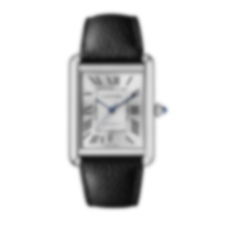 Tank Must watch, extra-large model, mechanical movement with automatic winding, calibre. Steel case, beaded crown set with a synthetic cabochon-shaped spinel, silvered flinqué dial, blued-steel sword-shaped hands, black grained calfskin strap, interchangeable steel folding buckle, calendar aperture at 6 o'clock. Case dimensions: 41 mm x 31 mm, thickness: 8.4 mm. Water-resistant to 3 bar (approx. 30 metres).