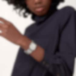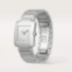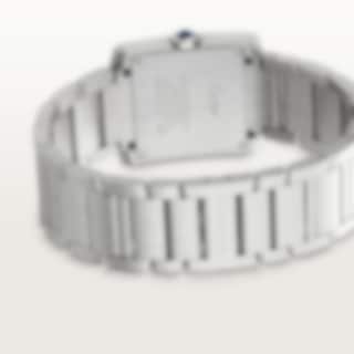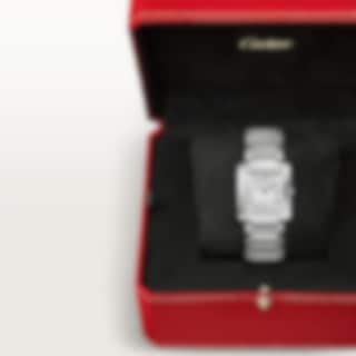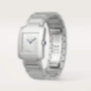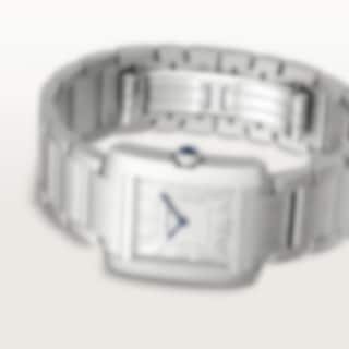 Tank Française watch, medium model, quartz movement. Steel case. Faceted crown in steel decorated with a synthetic cabochon-shaped spinel. Silvered dial, blued-steel sword-shaped hands, sapphire crystal. Steel bracelet. Case dimensions: 32 mm x 27 mm, thickness: 7.1 mm. Water-resistant to 3 bar (approx. 30 metres).
