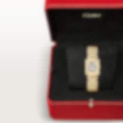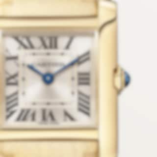 Tank Française watch, small model, quartz movement. Case in yellow gold 750/1000. Faceted crown in yellow gold 750/1000 decorated with a sapphire cabochon. Golden sunray dial, blued-steel sword-shaped hands, sapphire crystal. Bracelet in yellow gold 750/1000. Dimensions: 25.7 mm x 21.2 mm, thickness: 6.8 mm. Water-resistant to 3 bar (approx. 30 metres).