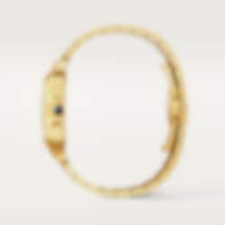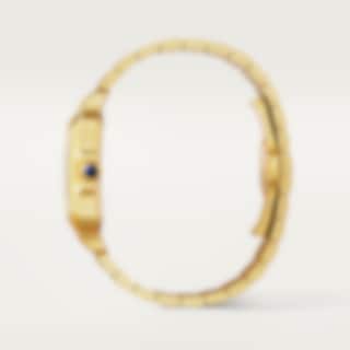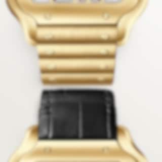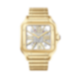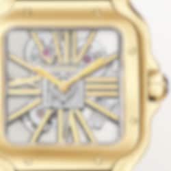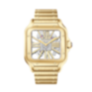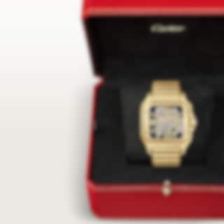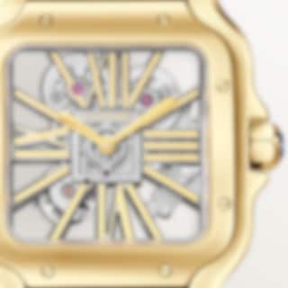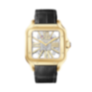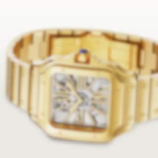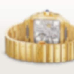 Santos de Cartier Skeleton watch, large model, skeleton mechanical movement with manual winding 9612 MC. Yellow gold 750/1000 case, 7-sided crown set with a faceted sapphire, gold-finish sword-shaped hands, sapphire crystal and case back. Yellow gold 750/1000 bracelet with SmartLink adjustment system. Semi-matte gray second strap in alligator leather, with interchangeable yellow gold 750/1000 folding buckle.