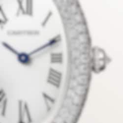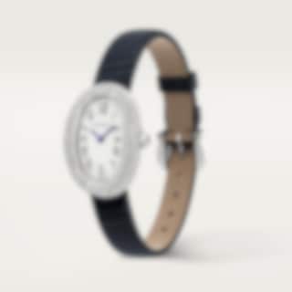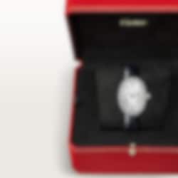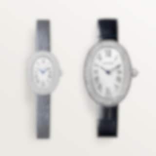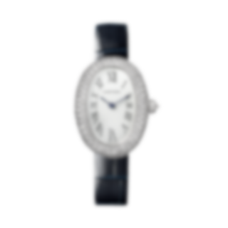 Baignoire watch, small model, quartz movement. 18K white gold (750/1000) case set with brilliant-cut diamonds. 18K white gold (750/1000) beaded crown set with a brilliant-cut diamond. Silver 925/1000 dial, blued-steel sword-shaped hands, sapphire crystal. Strap in navy blue alligator leather, with rhodiumized 18K white gold (750/1000) ardillon buckle. Case dimensions: 32 mm x 26 mm. Thickness: 8 mm. Water-resistant up to 3 bar (approx. 30 meters/100 feet).