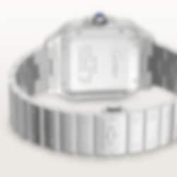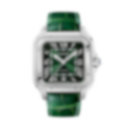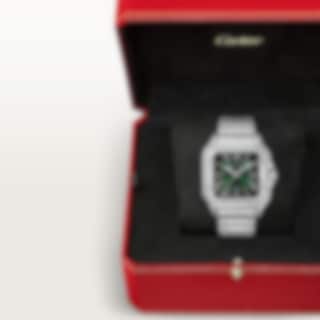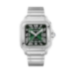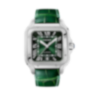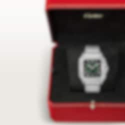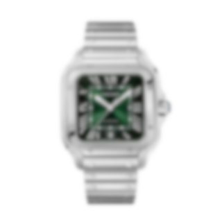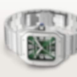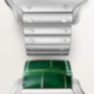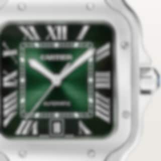 Santos de Cartier watch, large model, mechanical movement with automatic winding 1847 MC. Steel case, 7-sided crown set with a synthetic faceted blue spinel, graduated green dial, polished steel sword-shaped hands with luminescent material, sapphire crystal. Steel bracelet with SmartLink adjustment system. Second strap in green alligator skin, with interchangeable steel folding buckle. Both are fitted with the QuickSwitch interchangeable system. Case width: 39.8 mm, thickness: 9.38 mm. Water-resistant up to 10 bar (approx. 100 meters/330 feet).