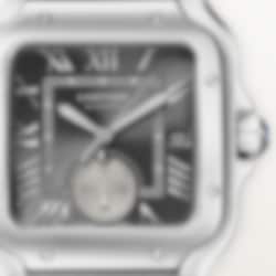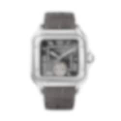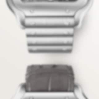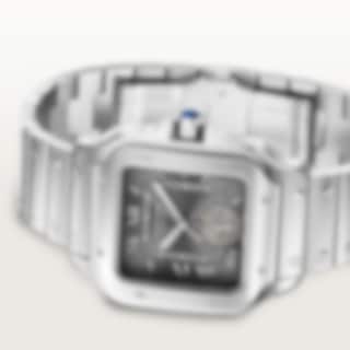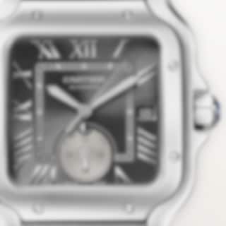 Santos de Cartier Dual Time watch, large model, mechanical movement, dual time zone. Steel case, 7-sided crown with a synthetic faceted blue spinel, satin-finish anthracite gray sunray-brushed dial, second time zone display with an additional hour hand in a counter and a day/night indicator. Rhodium-finish polished steel sword-shaped hands with luminescent material, sapphire crystal. Steel bracelet with SmartLink adjustment system. Second strap in gray alligator leather, with interchangeable folding steel buckle. Both are fitted with the QuickSwitch interchangeable system. Case width: 40.2 mm, thickness: 10.1 mm. Water-resistant to 10 bar (approx. 100 meters).