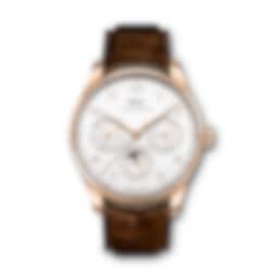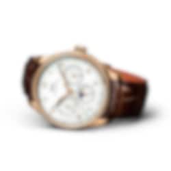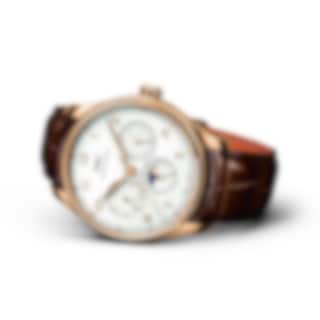 IWC’s perpetual calendar, developed by Kurt Klaus in the 1980s, automatically recognizes the different lengths of the months and the leap years and can easily be adjusted via a single crown. Now, for the first time, the complication is integrated into a movement from the 82000-calibre family. The Portugieser Perpetual Calendar 42 displays the date, month and weekday on three subdials at "3 o'clock", "6 o'clock" and "9 o'clock". It also features indications for the moon phase and the leap year. With the help of ceramic components, the IWC-manufactured 82650 calibre’s Pellaton winding system builds up a power reserve of 60 hours. This timepiece with a diameter of 42 millimetres has an 18-carat 5N gold case, a silver-plated dial, gold-plated hands, and 18-carat gold appliqués. This timeless, elegant Portugieser is fitted with a brown alligator leather strap from Santoni.