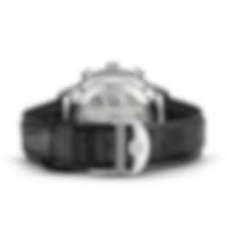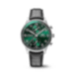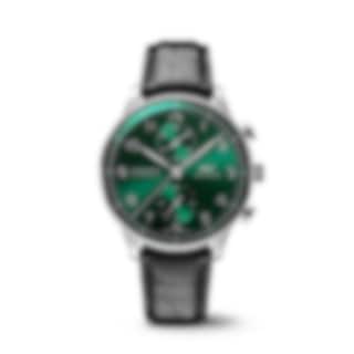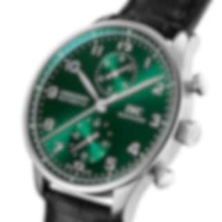 The Portugieser Chronograph is one of IWC Schaffhausen’s most iconic models. With its compact diameter of 41 millimetres, it fits almost any wrist. However, the thin bezel gives the impression of wearing a significantly larger timepiece. The clear, functional dial boasts applied Arabic numerals and slender Feuille hands. Printed with a quarter-second scale, the inner réhaut not only allows precise reading of the stop time but also reminds us of the Portugieser’s origins as a nautical precision instrument for the wrist. This model features a stainless steel case, a green dial, as well as rhodium-plated hands and appliqués; it is fitted with a black alligator leather strap. Inside the sporty-elegant chronograph, the IWC-manufactured 69355 calibre is at work. The robust and precise chronograph movement in classic column-wheel design is visible through a sapphire-glass case back.