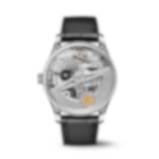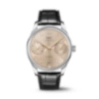 This version features a stainless steel case with a diameter of 42.4 millimeters, a Dune dial, and gold-plated hands and gold appliques. The watch appears elegant and refined thanks to a thoroughly reworked case construction with a thinner casing ring and box-glass sapphire crystals on the front and the back. A highlight is the intricately crafted dial, which is manufactured in a complex process comprising 60 individual steps. The unusual optical depth is created by applying 15 layers of transparent lacquer, which is fine-ground and then polished to a high gloss finish. The subdials are milled into both the brass blank and the lacquer layer. A special printing process further enhances the three-dimensional effect. Finally, the appliques are individually mounted on the dial by hand. The Portugieser Automatic 42 is powered by the IWC-manufactured 52011 caliber, which is elaborately finished with circular Geneva stripes. The Pellaton winding system is reinforced with virtually wear-free zirconium oxide ceramic components and builds up a power reserve of seven days (168 hours) in two barrels. The watch is fitted with a black alligator leather strap with a stainless steel folding clasp.