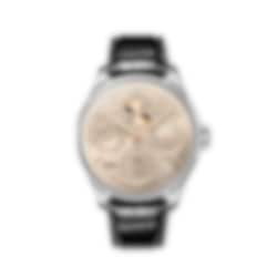 The perpetual calendar automatically recognizes the different lengths of the months and adds a leap day every four years at the end of February. All its displays are perfectly synchronized with each other and can be advanced easily via a single crown. The IWC-typical Double MoonTM display shows the moon as it can be seen from the Northern and Southern hemispheres. Thanks to a special reduction gear, the indication will only deviate from the moon’s actual orbit by one day after 577.7 years.