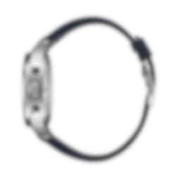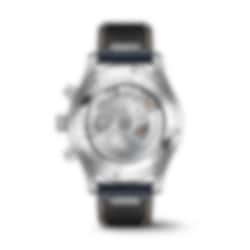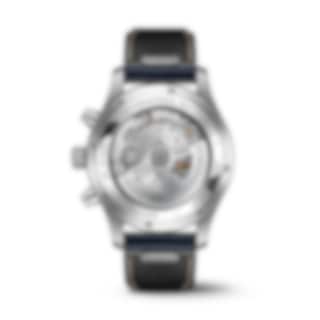 The IWC-manufactured 69385 caliber, a precise and robust chronograph movement in classic column-wheel design, enables measurement of stop or aggregate times of up to 12 hours. The hours are displayed on the counter at 9 o’clock, the minutes at 12 o’clock. The small second features a red hand and is located at 6 o’clock. The self-winding movement with a power reserve of 46 hours is visible through the sapphire glass back. Water-resistant to 10 bar, the chronograph is fitted on a blue calfskin strap with a pin buckle. Thanks to the integrated EasX-CHANGE® system, the strap can be easily changed without additional tools.