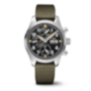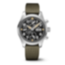 Stainless steel case, Automatic, self-winding, Diameter 41.0 mm, Black dial, Black dial with luminescence, Green textile strap, Strap width 20.0 mm. Made in Switzerland.