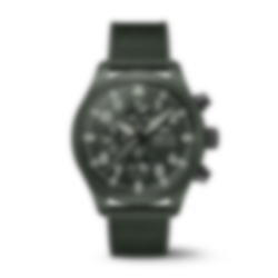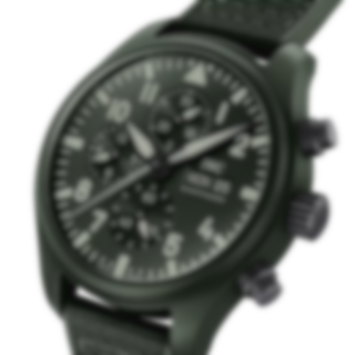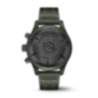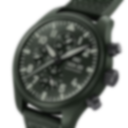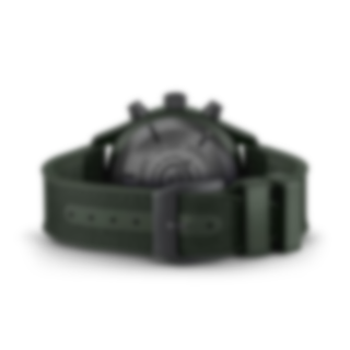 The monochromatic design is completed by a dark green dial and black hands and printing and luminescent material in a subdued green. The pushers, crown, and case back with an engraving of the TOP GUN logo are made of Ceratanium®. This matte black IWC material is as light and unbreakable as titanium and, at the same time, similarly hard and scratch-resistant as ceramic.