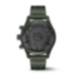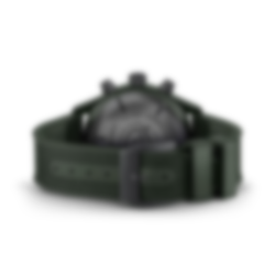 This TOP GUN chronograph is fitted on a green rubber strap with textile inlay, whose color has been perfectly matched to the “Woodland” case.