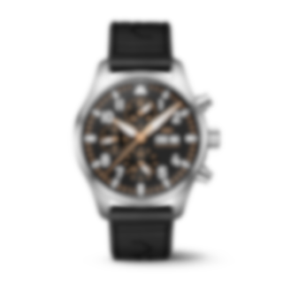 Dedicated to the fictional “APXGP” team from the movie F1®, the Pilot’s Watch Chronograph APXGP features a design in the team’s colors with black, gold and white elements. A stainless steel case with a diameter of 43 millimeters is combined with a black dial, which is printed with white numerals and golden minute markers.