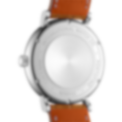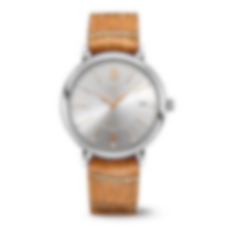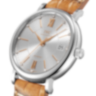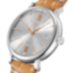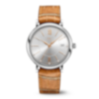 Stainless steel case, Automatic, self-winding, Diameter 37.0 mm, Silver-plated dial, Light brown alligator leather strap by Santoni, Strap width 18.0 mm. Made in Switzerland.