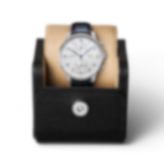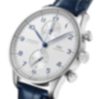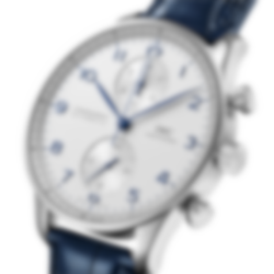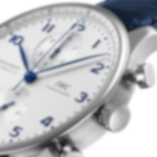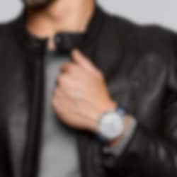 Stainless steel case, Automatic, self-winding, Diameter 41.0 mm, Silver-plated dial, Blue alligator leather strap, Strap width 20.0 mm. Made in Switzerland.