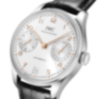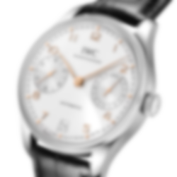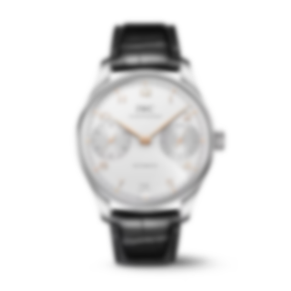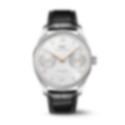 The Portugieser Automatic 42 is powered by the IWC-manufactured 52011 caliber, which is elaborately finished with circular graining and Geneva stripes. The Pellaton winding system is reinforced with virtually wear-free zirconium oxide ceramic components and builds up a power reserve of seven days (168 hours) in two barrels. The watch is fitted with a black alligator leather strap with a stainless steel folding clasp.
