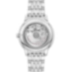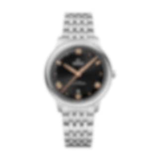 In this 40 mm stainless steel model, the domed PVD black dial features a sun-brushed finish. The display is distinguished by PVD Sedna™ Gold coloured hands, as well as alternating Roman numerals and cabochon indexes.