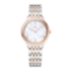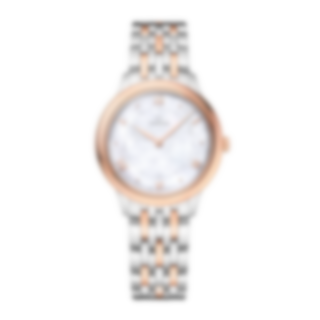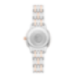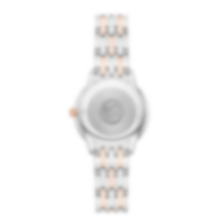 In this 30 mm stainless steel - 18K Sedna™ Gold model, the dial is crafted from white mother-of-pearl. The display is distinguished by PVD Sedna™ Gold coloured hands, as well as alternating Roman numerals and cabochon indexes.