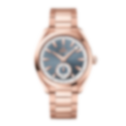 The sun-brushed blue-grey dial is distinguished by a horizontal “teak” pattern, along with a date window at 6H and an opaline Small Seconds subdial featuring an 18K Sedna™ gold ring.