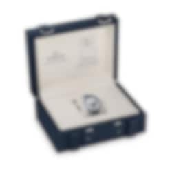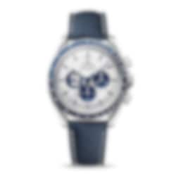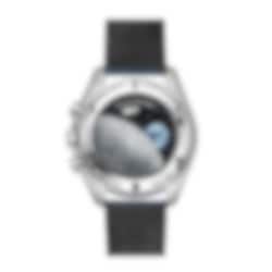 När du aktiverar kronograf-funktionen så ser du på baksidan en rymdkapsel röra sig i takt med sekundvisaren. Modellen har en vit urtavla med blå subdials.