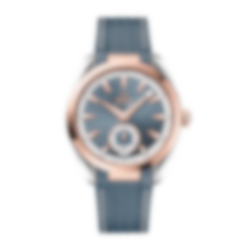 The sun-brushed blue-grey dial is distinguished by a horizontal “teak” pattern, along with a date window at 6H and an opaline Small Seconds subdial featuring an 18K Sedna™ gold ring. The design is further complemented by 18K Sedna™ gold hands and indexes filled with white Super-LumiNova, as well as sandblasted minutes and seconds tracks on the dial and subdial.