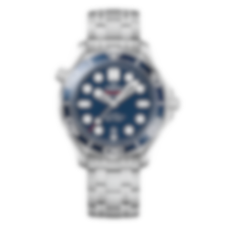 En blå keramisk vridring/bezel är monterad på en 42 mm boett med en heliumventil vid klockan 10.
