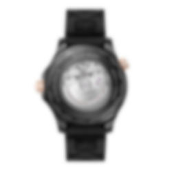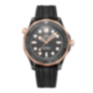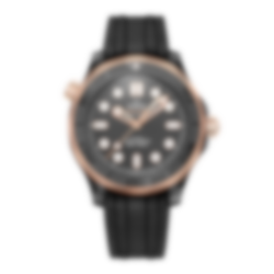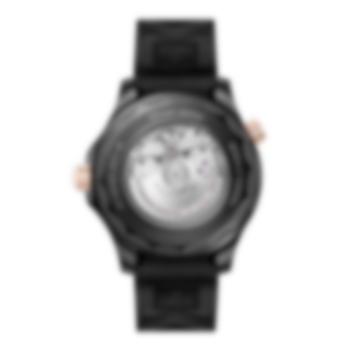 This 43.50 mm model, cased in black ceramic [ZrO2] and Sedna™ gold, has a black ceramic dial with laser-ablated waves in positive relief. The polished Sedna™ gold indexes and facetted hands, filled with white Super-LumiNova, contrast beautifully with the black dial. Completing the look is an integrated black rubber strap with black ceramic buckle.