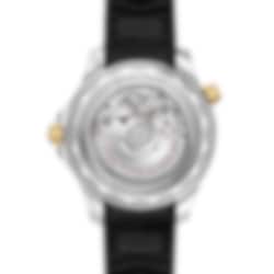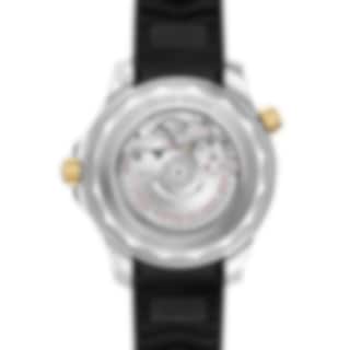 This 42 mm model is crafted from stainless steel and 18K yellow gold, and includes a black ceramic bezel with a Ceragold™ diving scale. The dial is also polished black ceramic and features laser-engraved waves and a date window at 6 o’clock.